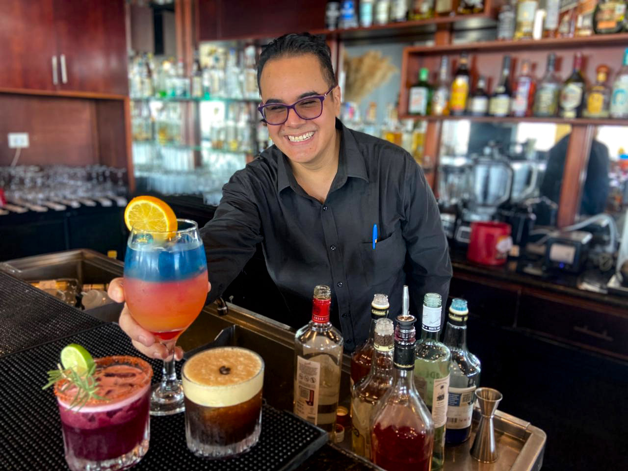 La experiencia se complementa con una mixología que sorprende por su calidad y personalidad. Las bebidas, diseñadas con ingredientes frescos y guiños evidentes a la cultura local, mezclan frutas, hierbas y destilados con un equilibrio que seduce al primer sorbo. Hay cocteles que evocan la frescura del mar, otros que recuerdan el aroma de la tierra húmeda después de la lluvia, y algunos que se inspiran en la tradición costera y en los sabores dulces de temporada. Más que bebidas, son acompañantes ideales para contemplar la bahía desde las alturas.