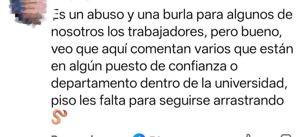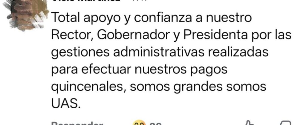 Desde las áreas de dirección se presiona a los trabajadores que ocupan puestos de confianza a publicar comentarios de apoyo a la administración. No les queda de otra ya que, aunque también son afectados, si no lo hacen podrían perder su empleo. Sin embargo cada vez son más los que ya no siguen esta dinámica. La falta del salario, que es un derecho de todo trabajador, se ve reflejado en comentarios certeros contra la administración de la llamada máxima casa de estudios de Sinaloa.